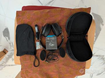 Vendo per inutilizzo le cuffie wireless in oggetto. Cuffie eccellenti, funzionalmente perfette, complete di cavi di connessione (USB tipo B e jack), sacchetto protettivo, custodia, manuale di istruzioni. Ottima resa sonora, ottima cancellazione del rumore. Come si vede dalle foto, i padiglioni sono usurati, ma è solo una questione estetica: possono essere sostituiti con poca spesa, e comunque lo stato in cui si trovano non pregiudica né la comodità di utilizzo né la qualità di ascolto.