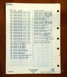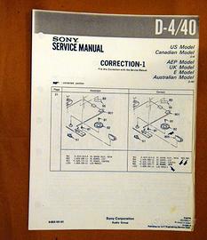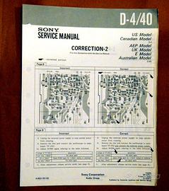 SONY COMPACT DISC PLAYER D4-D40, tutte le pagine sono complete. 10 pagine tra specifiche, sezione generale, regolazioni elettriche, disassemblaggio, esploso del discman, lista dei componenti elettronici e tabelle grafiche. + 1 supplemento con diagrammi sostituzione parti meccaniche aggiornato. +1 supplemento con correzione parti elettriche aggiornato.