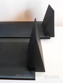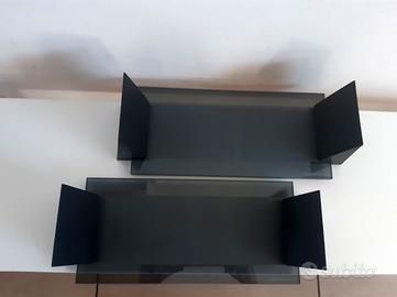 Coppia di porta CD/ storage rack/ rack di archiviazione CD originali Bang & Olufsen Design pulito, semplice e originale, vintage anni 2000 circa Possono essere usati anche come mensole da scrivania Formati da un piano in vetro sorretto da due supporti triangolari -vetro temperato grigio spesso 10 mm (presenta una striscia sabbiata che impedisce ai CD di scivolare) -supporti triangolari in gomma nera rigida Dimensioni: vetro cm 30 x 14 L complessiva (con supporti) cm 35, H max (con supporti) cm 11 Ognuno contiene 25 CD Marchiati su vetro BANG & OLUFSEN In ottime condizioni vintage, sempre tenuti in casa vicino allo stereo