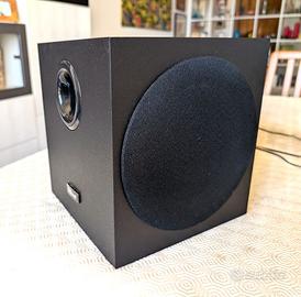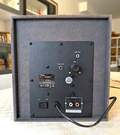 Composto da subwoofer in legno con design bass reflex e ampio cono per bassi profondi, satelliti inclinabili per scegliere la posizione di ascolto ottimale e telecomando cablato con controllo volume e interruttore di accensione.