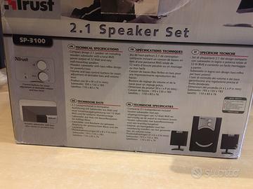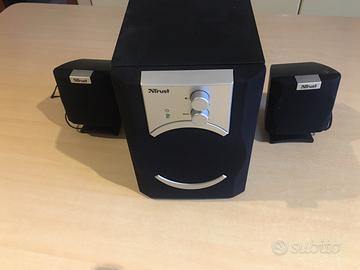 Set di altoparlanti 2.1 marca TRUST, dal design compatto con subwoofer in legno, potenza totale 12W RMS, consente facile montaggio da parete. (Subwoofer 193X135X183 mm) ( Satelliti 110X83X76 mm).