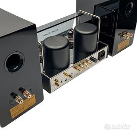 Il bundle Blue Aura v50 + AT700 è la soluzione ideale per chi desidera un sistema hi-fi completo, semplice e raffinato, perfettamente abbinato dal punto di vista tecnico ed estetico. Amplificatore Blue Aura v50 Amplificatore hi-fi ibrido con preamplificazione a valvole ECC83 europee e finale a transistor (Class AB), capace di offrire un suono caldo, dinamico e dettagliato. L’alimentazione con trasformatori toroidali ad alta efficienza assicura un segnale pulito e bassi livelli di distorsione. Il VU-meter retroilluminato permette il controllo visivo dei livelli, mentre la regolazione di bassi e alti è gestibile direttamente dal telecomando, mantenendo il frontale pulito ed elegante. Diffusori Blue Aura AT700 Diffusori da scaffale progettati per garantire bassi profondi, medi naturali e alte frequenze chiare. Facili da pilotare, si abbinano perfettamente al v50 per creare una scena sonora ampia e coinvolgente, adatta a ogni genere musicale. CARATTERISTICHE • Amplificatore ibrido valvole ECC83 + transistor (Class AB) • Diffusori da scaffale multi-via • Bassi profondi, ottima dinamica e definizione • Bluetooth aptX, USB-C, RCA, AUX • Uscita subwoofer per espansione futura • Usicta cuffie mini-jack 3.5mm frontale • Finitura elegante Blackline • Telecomando in alluminio incluso Unità ad Alta Frequenza AMT Unità a Bassa Frequenza Cono in carta da 4,5″ Risposta in Frequenza 45 – 40.000 Hz Frequenza di Crossover 12 dB/ottava a 4,7 kHz Potenza Massima RMS 50 watt per canale Dimensioni diffusori A: 253 mm L: 145 mm P: 205 mm Peso diffusori 3,8 kg ciascuno Dimensioni amplificatore A: 170 mm L: 294 mm P: 200 mm Peso amplificatore 6 kg Disponibilità immediata Prodotti nuovi e sigillati, disponibili in pronta consegna. 2 anni di garanzia In caso di difetto, sostituzione immediata con prodotto nuovo per tutta la durata della garanzia. Imballaggio originale con doppio cartone per massima protezione. Contattami per bundle personalizzati (es. v50 + AT700 + PG2).