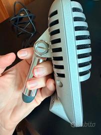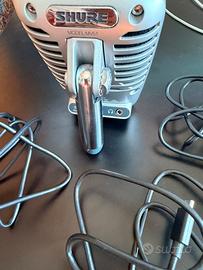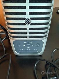Microfono A Condensatore Digitale iOS Usb-C ( cavetto con USB classica, Lighting per vecchio iPhone e usbc) USATO POCHISSIMO SENZA SEGNI DI USURA, GRAFFI O ALTRO PARI AL NUOVO Certificato Apple MFi ( Made for iPhone / iPod / iPad ), si connette a qualsiasi dispositivo iOS senza alcun adattatore aggiuntivo. Compatibile con i dispositivi Android che supportano connettività USB Audio Class 2.0 e Micro-B OTG ( On-The- Go ). Non tutti i dispositivi Android sono compatibili. 5 Modalità DSP (Parlato, Canto, Flat, Strumenti Acustici, Loud) : Regola automaticamente Gain, EQ , compressione e limiting per ottenere risultati ottimali. Controlli su touch panel frontale per la selezione della modalità, del volume delle cuffie, del guadagno del microfono, e del mute Uscita cuffie integrata per il monitoraggio in tempo reale Il diaframma da 25mm fornisce l'audio migliore della categoria Il cavalletto posteriore integrato offre un posizionamento ottimale su qualsiasi scrivania Include supporto con filettatura standard da 5/8” per il montaggio su qualsiasi asta microfonica Include (1) cavo MicroB-a-USB e (1) cavo Micro-B a Lightning® e (1) cavo USB-C-to-MicroUSB Cable Design di ispirazione vintage interamente in metallo Tipo Trasduttore: Condensatore Caratteristica Polare: Cardioide Risposta in Frequenza: 20 Hz - 20 kHz Sensibilità (1 kHz): -39 dBV/Pa Peso: 574.4 g
