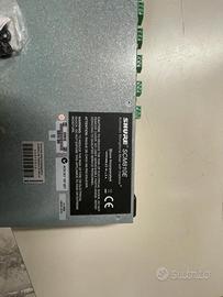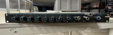 Shure SCM810 (Mixer automatico a 8 canali) Lo Shure SCM810 è un mixer automatico a 8 canali, progettato per installazioni professionali, sale conferenze, aule, riunioni e sistemi PA complessi. Utilizza la tecnologia IntelliMix che attiva solo i microfoni effettivamente utilizzati, riducendo il rumore di fondo e migliorando la chiarezza. 🔌 Caratteristiche Principali 8 canali microfonici/linea bilanciati (connettori Phoenix / blocco estraibile). IntelliMix® per attivazione intelligente dei microfoni. Last Mic Lock-On per mantenere aperto l’ultimo microfono usato e preservare l'ambiente sonoro. NOMA (Number of Open Microphones Attenuator): riduce automaticamente il guadagno totale quando più microfoni sono aperti. EQ regolabile per canale: Low‑cut regolabile High‑shelf 48 V phantom power, selezionabile per ciascun canale. Limiter di uscita a soglia selezionabile. Chassis resistente alle interferenze RF. Possibilità di collegamento in cascata fino a 400 microfoni. Uscita cuffie con regolazione frontale. 🎚 Specifiche Tecniche Risposta in frequenza 50 Hz – 20 kHz ±2 dB Angolo -3 dB a 25 Hz Guadagno (tipico, controlli al massimo) Uscita Linea: 80 dB Mic low‑impedance (150 Ω): 80 dB Line: 40 dB Aux Send/Return: 20 dB Direct Out: 34 dB Cuffie: 88 dB Impedenze Ingressi (progettati per): Mic: 19–600 Ω Line: 32 kΩ Aux Send/Return: 32 kΩ Valori reali tipici: 10 kΩ per tutti gli ingressi Uscite: Line: >600 Ω Direct Out: >2 kΩ Send/Return: >2 kΩ Cuffie: 8–200 Ω (60 Ω consigliati) Livelli di clipping input Mic: –15 dBV Line: +22 dBV Aux/Return: +22 dBV Cuffie: +18 dBV Distorsione armonica totale < 0.1% (50 Hz – 20 kHz @ +18 dBV) 🔄 Connettività 8 ingressi MIC/LINE bilanciati (Phoenix). 8 Direct Out (uno per canale). 1 uscita master linea bilanciata (Phoenix). 1 ingresso AUX non automatico. Porta logica per attivazione controllo esterno. ⚙️ Funzioni Automatiche Noise Adaptive Threshold: distingue tra rumore costante e voce. MAXBUS™: impedisce l’attivazione simultanea di più m