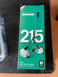 Shure SE 215 trasparenti con cavo nero e microfono, comprate, usate per qualche giorno e riposte nella custodia