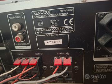 Sintoamplificatore kenwood KRF-V5100D come da foto, con telecomando, cavetti di collegamento alimentazione e casse (centrale-laterali x 5) + 1 x subwoofer, perfettamente funzionante. PREZZO NON TRATTABILE.