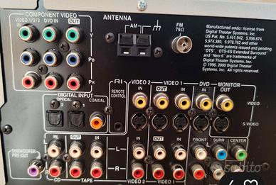 Sintoamplificatore Onkyo TX-SR501E completo di telecomando originale SintoAmplificatore usato funzionante in ottime condizioni completo di telecomando originale Cratteristiche: Tipo: WRAT (Wide Range Amplifier Technology) Circuito ottimizzato per il guadagno di volume Audio/Video Dolby Digital EX e Pro Logic II DTS, DTS-ES Matrix/Discrete 6.1 e DTS Neo (elaborazione) Cinema Filter, FM Stereo Receiver Tuner con RDS Convertitori lineari PCM 96kHz / D/A 24 bit crossover regolabile (60, 80, 100, 120, 150 Hz) Elaborazione DSP avanzato a 24 bit Frontale: argento con scritte nero / oro Display comando a cristalli liquidi multicolor Potenza nominale: 500W Potenza canale: 80W min.in RMS su 6 ohm Ingressi RCA Audio: Cd, Tape, Video 1/2/3, DVD Ingressi RCA + S-Video: Video 1/2/3, DVD Ingressi Component: Video 1/2/3, DVD Sub-woofer Pre Out Uscita Component: Out Uscite RCA Audio: Tape, Video 1 Uscite RCA + S Video: Video 1, Monitor Out Uscita Component: Out Uscite Audio Digitale: 1 x coaxial , 2 x Optical jack per cuffie da 3,5mm 6+1 canali impedenza speaker da 6 ohm a 16 Ohm Gamme d'onda: FM - AM 30 Stazioni memorizzabili in FM suddivise Frequenza scala radio FM: 87,5 Mhz - 108 Mhz Frequenza scala radio AM: 0,55 Mhz - 1,6 Mhz Scorrimento frequenze digitale Alimentazione a corrente alternata (CA) 230 Volt 50Hz Dimensioni: L-43.5cm x H-15cm x P-37.6cm Peso: 10.8Kg