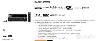 Sintoamplificatore AV 5.1 canaliRXD 485-DAB/DAB+:completo di supporto MusicCast Surround e di un'eccezionale facilità d'uso per il massimo dell'intrattenimento. Include anche il sintonizzatore DAB/ DAB+.