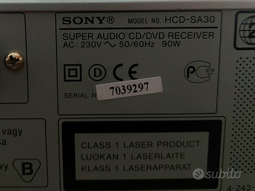 Sintolettore DVD Sony mod. HCD-SA30 con sintonizzatore radio AM-FM, lettore CD-DVD, amplificatore Home Theatre 5 ch+1, sistema completo di altoparlanti (5) e subwoofer (1) e libretto d'istruzione originale. Vendo per passaggio a sistema superiore.