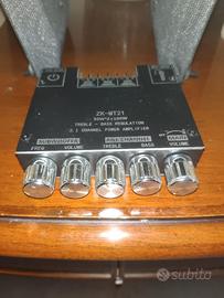 Sistema da scrivania, adatto anche per piccole camere. E' composto da un amplificatore 2.1. classe D, mod. ZK-MT21, da 20+20 W R.M.S. sui canali stereo e 40 W R.M.S. (Watt veri, non quelli PMPO che non spingono nulla) sul subwoofer, se alimentato con 21 V, con controllo del volume generale, bassi e acuti dei canali stereo, selezione della frequenza di taglio e del volume del sub. Si collega tramite bluetooth o con l'ingresso jack. Completa il sistema la coppia di altoparlanti JVC (dimensioni H 30 x L 17 x P 25 cm circa), predisposte per la biamplificazione (canale sub e main). Fornisco un alimentatore da 12V, sufficiente per l'ascolto "da scrivania" ma per avere maggiore potenza ( e farsi cacciare dal condominio) consiglio un alimentatore per notebook da 19-21 V e almeno 4 Ampere. Sconto solo per il ritiro a mano.
