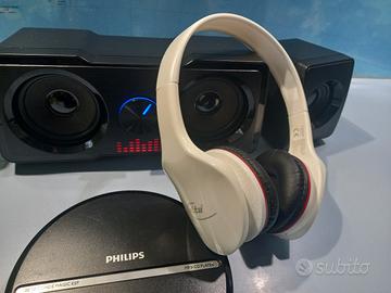 Vendo sistema composito audio formato da lettore CD mp3 portatile Philips con memoria antishoc, cuffie Elta e altoparlanti amplificati rgb Mars Gaming.