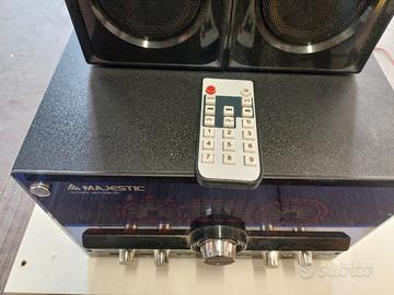 vendo sistema audio majestic modello AH2340K 2.1 con subwoofer integrato ingressi USB e SD per mp3 ingresso aux per funzione karaoke con casse e microfono perfettamente funzionante usato pochissimo manca solo il cavetto per il microfono che costa pochissimo prezzo affare!!