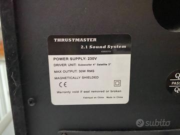 Vendo sistema audio Thrustmaster 2.1 perfettamente funzionante e con le seguenti specifiche: * THRUSTMASTER * Sistema audio 2.1 * 4060019 * ALIMENTAZIONE: 230V * UNITÀ DRIVER: Subwoofer 4" Satellite 3" * POTENZA MASSIMA: 30W RMS * SCHERMATURA MAGNETICA * CE
