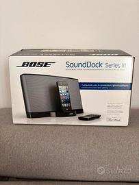 Sistema de audio digital Bose SoundDock Series III. con connettore Lightning, perfettamente funzionante. È un sistema audio di ottima qualità, ideale per ascoltare musica da iPhone o iPod con attacco Lightning, con ricarica del dispositivo mentre è inserito. Dispone anche di ingresso AUX da 3,5 mm per collegare altre sorgenti audio come smartphone, tablet o computer tramite cavo.