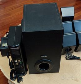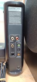 Ho usato questo sistema come HOME THEATRE collegandolo al televisore e la resa è molto buona, soprattutto quando nella riproduzione ci sono tutti i canali perché crea una sensazione immersiva passando l'audio da un canale all'altro o con gli altoparlanti posizionati dietro allo spettatore. Funziona tutto e ovviamente ha qualche segno di un normale utilizzo.