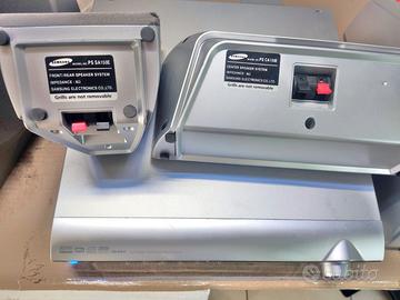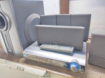 Sistema Home Theater Samsung HT-DM150 completo e perfettamente funzionante. Usato, come da foto, in ottime condizioni Tutti gli altoparlanti sono stati testati personalmente e ho caricato un video dimostrativo per mostrare la qualità del suono. Questo impianto 5.1 canali offre un’esperienza audio immersiva, ideale per film, musica e videogiochi, grazie alla potenza totale di 300W e al supporto dei principali formati audio digitali. 🔊 Caratteristiche principali Sistema audio Surround 5.1 canali Lettore DVD/CD integrato Compatibile con DVD, CD, MP3 e JPEG Decoder audio DTS e Dolby Digital Radio FM integrata Telecomando originale incluso Design compatto ed elegante 🔈 Potenza audio 5 altoparlanti satellitari: 40W ciascuno (impedenza 6Ω) a 2 vie, altezza 18 cm Subwoofer: 70W (impedenza 3Ω) con struttura solida e buona qualità costruttiva 🔌 Connettività Ingresso AUX (sensibilità 500mV) Uscita S-Video Presa SCART 📦 Contenuto della confezione Unità DVD Home Theatre Samsung HT-DM150 (x1) Altoparlanti surround PS-SA150E (x4) Altoparlante centrale PS-CA150E (x1) Subwoofer PS-WA150R (x1) Telecomando originale Cavi per altoparlanti