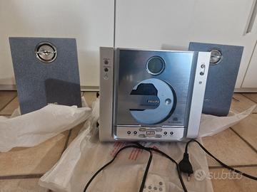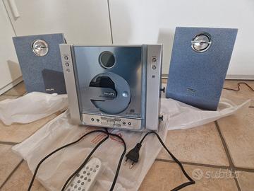 Vendo elegante sistema micro Hi-Fi della Philips (modello MC230), perfettamente funzionante e in ottime condizioni estetiche. È un pezzo dal design unico, ideale per arredare piccoli spazi, uffici o camere da letto senza rinunciare a un audio di qualità. Caratteristiche principali: Lettore CD: Caricamento frontale motorizzato con sportello trasparente (bellissimo da vedere mentre il disco gira). Radio FM/AM: Sintonizzatore digitale con possibilità di memorizzare le stazioni. Audio: Casse originali con finitura in tessuto blu/grigio, suono pulito e bilanciato. Design: Ultra sottile, può essere anche appeso alla parete (wall-mountable). Extra: Include telecomando originale e cavi di alimentazione/collegamento. Condizioni: L'impianto è stato tenuto con cura. Non presenta graffi ed è stato testato prima della messa in vendita.