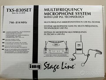 IMG Stage Line TXS-830SET - Set per microfoni wireless multifrequenza. La confezione, praticamente nuova, comprende: 1 microfono ad archetto, 1 microfono a clip, 1 trasmettitore tascabile, 1 ricevitore, 1 alimentatore plug-in 230 V~/50 Hz / 5 VA, Sistema di switching diversity, 16 canali UHF selezionabili (790 - 814 MHz), Controlli di volume e squelch, Installazione a rack da 482 mm (19") dell'unità ricevente possibile con le staffe di montaggio in dotazione.