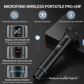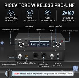 sistema microfono wireless, marca Tonor, modello TW750, microfono ricaricabile professionale, microfono dinamico cordless in metallo 2x100 UHF per karaoke, chiesa, canto, matrimonio, riunione, DJ, Auto Scan, 328ft, Scansione automatica e accoppiamento IR: seleziona automaticamente le frequenze più stabili e prive di interferenze; il processo di accoppiamento IR è facile e veloce; include 100 frequenze UHF (da 536,570 a 587,120 MHz) Eccellente stabilità del segnale: il più recente chip PRO-UHF e le antenne anti-interferenza offrono una distanza di trasmissione ultra-lunga e stabile di 100 m; nessun dropout, interferenza o distorsione Qualità del suono elevata: microfono dinamico cardioide di fascia alta che offre una qualità del suono chiara e autentica; supporta dispositivi audio con porte da 6,35 mm/3,5 mm/XLR; ideale per karaoke, chiesa, matrimoni, spettacoli, discorsi, ecc Microfoni ricaricabili: i microfoni sono dotati di batterie ricaricabili integrate da 1200 mAh, senza bisogno di batterie AA; si ricaricano completamente in 3 ore e durano 7-9 ore; include un cavo Type-C a doppia estremità per la ricarica simultanea Funzione Mute e indicatore LED: premi il pulsante del microfono wireless per silenziarlo; sia il pulsante del microfono che la parte inferiore sono dotati di spia LED per indicare lo stato di funzionamento, di ricarica o di disattivazione dell'audio