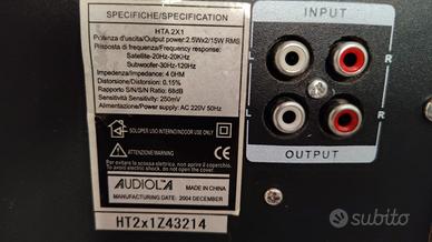 Il componente centrale più grande, etichettato "AUDIOLA", è un subwoofer, progettato per riprodurre le basse frequenze (bassi).
