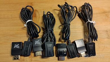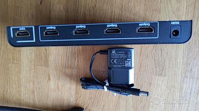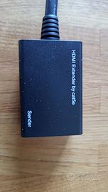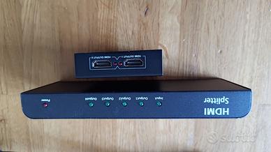 Sistema completo per visualizzare una fonte in HDMI su altre apparecchiature HDMI a distanza collegate tramite due cavi Ethernet. Il sistema è composto dalle seguenti apparecchiature: Marca eSYNiC 1x4 HDMI splitter 3D per 1 ingresso e 4 uscite con alimentatore. Lo splitter direziona il segnale automaticamente a seconda della richiesta da parte delle periferiche che lo richiedono. 1x2 HDMI splitter attivo con alimentazione. Riceve un ingresso HDMI e lo commuta a due uscite verso utilizzatori. 2 coppie di HDMI extender by cat5e, 2 sender e 2 receiver. Il cuore del sistema connessi alle prese HDMI dello splitter(sender) interconnessi tramite due cavi Ethernet cat5e a due apparecchi(receiver). Se serve trasmettere il segnale IR del telecomando aggiungo due coppie di trasmettitori segnale IR tramite HDMI. Tre cavi HDMI di varie misure. Sistema testato e funzionante. Possibilità di fornire anche cavo Ethernet cat5e (secondo disponibilità)