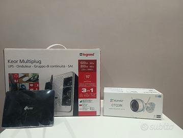Vendo Pacchetto videosorveglianza composto da tutti prodotti di qualità che comprendono UPS BTicino legrand sinonimo di garanzia e affidabilità, telecamera Ezviz con visione notturna a colore wifi oppure cavo da 2mpx si vede uno spettacolo,modem con SIM tp-link,in pratica con questo sistema separato se i ladri staccano la corrente e quindi anche il vostro modem principale di casa,le riprese continuano tranquillamente ovviamente UPS e modem devono essere nascosti,il modem con sim collegato al gruppo permetterà le riprese. No perditempo