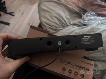 Smalody Tipo di altoparlante Soundbar Potenza massima in uscita dell'altoparlante 10 Watt Risposta in frequenza 18000 Hz Tecnologia di connettività USB Modalità uscita audio stereo Ortima soundbar semplice x portatili e pc fissi. Vendo perche sono passato a soundbar Bose. Non sonompressnti sgraffi funziona perfettamente.