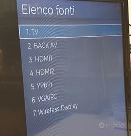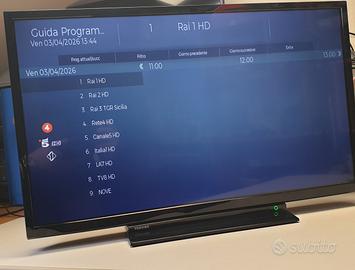 Toshiba SmartTV 32 pollici Full HD 1920 x 1080 Perfettamente funzionante. Non ha bisogno di decoder esterno. Digirale terrestre DVB-T2 incorporato. ingresso satellitare incorporato. 32” HD LED TV DVB-T DVB-T2 DVB-S H.265 (HEVC) Avi Mp4 Manca il telecomando. Reperibile universale con pochi euro. ingressi HDMI SCART VGA USB RGB No scambi. Solo ritiro in loco o in zone limitrofe da concordare. NON SPEDISCO. Massima serietà. Non fate proposte assurde perché neanche verranno prese in considerazione.