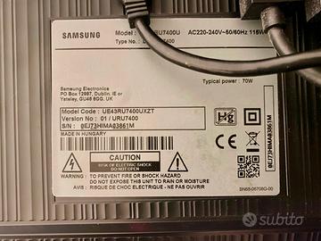 Smart TV 43’’ in perfette condizioni con base, telecomando e manuale. No scatola. Mod. UE43RU7400UXZT. NO SPEDIZIONE. RITIRO A MANO. PREZZO NON TRATTABILE.