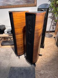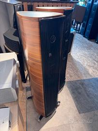 Coppia di diffusori da pavimento - 3 vie - porta reflex laterale a sviluppo verticale - tweeter custom arrow point dad - unita` medio bassa da 150 mm custom con membrana in in compound di materiali naturali non pressati e senza asciugatura forzata - woofer derivato da quello dell' aida con membrana in sandwich di materiale high tech e polpa di cellulosa - cabinet antirisonante a forma di lira con tripla curvatura e spesore variabile in massello di noce - risposta in frequenza 40-30000 hz - sensibilita` 88 db/w/m - impedenza nominale 4 ohms - amplificatore consigliato con potenza compresa tra 50 e 250 w - dimensioni: 370 x 1055 x 472 (lxaxp)