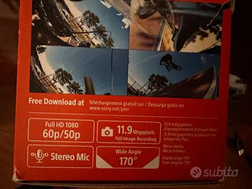 Sony Action Cam HDR-AS20,obiettivo grandangolare ZEISS Tessar, campo visivo di 170° (120° con SteadyShot attivato), sensoreCMOS Exmor R retroilluminato da 11,9 megapixel,risoluzioneFull HD, fino a 50 fotogrammi al secondo.slowmotion alla risoluzione di 1280 x 720 pixel e 120 fotogrammi al secondo. Il formato utilizzato offre una qualità che può raggiungere i 28 Mbps. Buone condizioni con corredo originale.