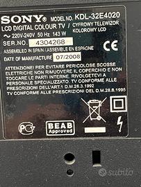 modello KDL - 32E4020 colore grigio chiaro, perfettamente funzionante Incluso decoder tv sat Preferibilmente consegna a Lavagna
