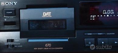 SONY DTC-670 DAT Digital. Lettore e registratore Hi-Fi di Alta qualità Perfettamente funzionante. Testata sia in riproduzione che in registrazione, funziona benissimo. Alcuni piccoli Segni sulla parte superiore. Ovviamente si sta parlando di un registratore di almeno 30 anni, inevitabile che non ci siano. La Vendita fa parte della mia collezione personale che ho acquisito negli anni. Ottime condizioni. Tenuta in modo maniacale, possiedo tantissimi pezzi di Hi-Fi vintage circa un 40 pezzi forse più. Tecnicamente perfetta e funzionante subito pronta all'uso. Il display è chiaro e facilmente leggibile, l'illuminazione è buona. Specifiche: Frequenza di campionamento: 48, 44.1, 32 kHz. Gamma di frequenza: 2 Hz - 22 kHz. Rapporto segnale/rumore: 90 dB. Separazione dei canali: 94 dB. Digitale in: en Cinch/RCA ottico/Toslink Uscita digitale: Toslink/ottico Analogica in/out: Cinch/RCA Dimensioni: 43 x 13 x 35 cm Peso 8 kg Vale la clausola "Visto e Piaciuto": Con questa clausola, l'acquirente accetta esplicitamente l'articolo nello stato in cui si trova, proteggendo il venditore da possibili ripensamenti o reclami futuri relativi a difetti o problemi non dichiarati o non noti al momento della vendita.
