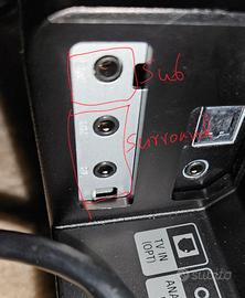 Alcuni utenti riferiscono che dietro un piccolo sportellino di plastica sul retro della HT-A7000 ci sono più porte jack 3,5 mm (tra cui una etichettata “SW” o simile) che possono essere usate per collegare un subwoofer esterno con un cavo 3,5 mm RCA. ,