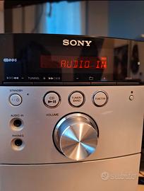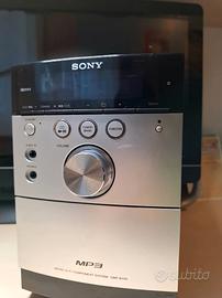 Sony micro hi-fi component system CMT-EH 15 stereo sony con 2 casse originali mai usate. Nella confezione originale trovate: stereo sony, 2 casse sony, libretto di istruzioni in lingue differenti. Lo stereo possiede già integrato l'antenna radio, un deck per cassette, un jack 3.5 per cuffie e auricolari e un riproduttore per CD. Telecomando NON INCLUSO, segnalo anche che la manopola per il volume è funzionante ma leggermente difettosa (nulla di grave) il tutto perfettamente funzionante. Per maggiori informazioni o domande scrivetemi in privato.