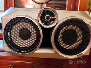 Come da descrizione propongo questo classico Sony degli anni '90. Trattasi di lettore caricatore cd con possibilità di gestirne 3 in contemporanea, dotato di ricevitore radio AM/FM, e doppio registratore a cassetta per registrare/riversare/duplicare cassette audio. Il tutto condito dai suoi diffusori originali per completezza di fornitura. A questi diffusori sono stati aggiornati entrambi gli altoparlanti. Le meccaniche, sia del lettore CD, che del lettore audio cassette, sono perfette. È stato sostituito il laser di lettura esaurito, sono state cambiate tutte le cinghie dei cassette decks. Insomma il prezzo che chiedo è quasi il prezzo che ho speso io per ripristinarlo. Suona molto bene e con bassa distorsione anche ai volumi più alti. Presenti ingressi per fonti esterne, compreso un ingresso ottimizzato per console videogiochi. Non siate timidi e compratelo subito
