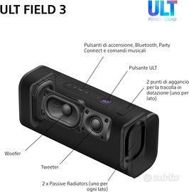 Vendo Speaker Sony ULT Field 3 nuovo MAI aperto con ULT POWER SOUND, bassi potenti, batteria 24 ore, IP67, impermeabile, antipolvere, antiurto, antiruggine, tracolla staccabile, compatto - Nero.