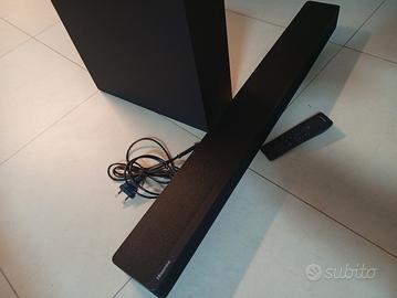 soundbar Hisense Nera 2.1 canali 240w Dolby audio con subwoofer wireless connessione tramite Bluetooth, cavo ottico, AUX