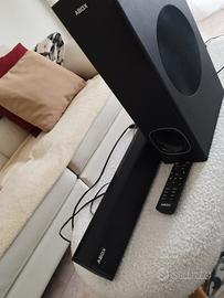 soundbar completa di subwoofer, telecomando e cavo ottico