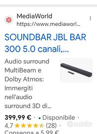 Tolgo per inutilizzo soundbar JBL Bar 300 come nuova,Watt 260, Canali 5,, bluetooth 5.0, HDMI eARC, HDMI cec, Optical in, Dolby Digitale, Dolby ATMOS, tecnologia MultiBeam audio 3D,, AirPlay,Alexa MRM,HDR 10, Dolby Vision,, completa di Cavo alimentazione e cavo HDMI, e telecomando, manca solo la scatola .
