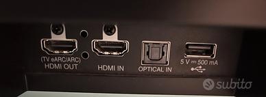 vendo per disuso Soundbar LG SP9YA + Subwoofer wireless. Caratteristiche: Potenza 520 W 5.1.2 Canali Estendibili a 7.1.2 acquistando i satelliti wireless Subwoofer Wireless Bluetooth AI Sound Pro TV Sound Sync High Resolution Audio Formati supportati: Dolby Digital e Digital Plus Dolby Vision e Dolby Atmos DTS Digital Surround Compatiblile con Google, Alexa, Airplay ConnessioniHDMI In e Out, Optical In, USB, Bluetooth Dimensioni Principali (L x A x P)1220 x 57 x 145 mm Subwoofer (L x A x P)221.0 x 390.0 x 312.8 mm Peso Soundbar5.8 kg Peso Subwoofer7.8 kg Ideale perTV da 55" in su Acquistato nel maggio 2022 a 600€ durante il black friday, è rimasto nella casa in montagna per sporadico uso e non avendo più quella casa non me ne faccio più nulla. Segnalo solo un segno, visibile in foto, che aveva già da quando l'ho acquistata e qualche segno superficiale del subwoofer. vendo completo di 2 telecomandi (1 originale ed uno compatibile nuovo) e libretto istruzioni stampato. Date le dimensioni ed il peso è previsto il solo ritiro a mano presso la mia abitazione.