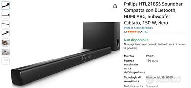 Philips HTL2183B Soundbar Compatta con Bluetooth, HDMI ARC, Subwoofer Cablato, 150 W, Nero. Del 2016, perfettamente funzionante, vendo per cambio modello nuovo. Pagata 130, vendo a 50.