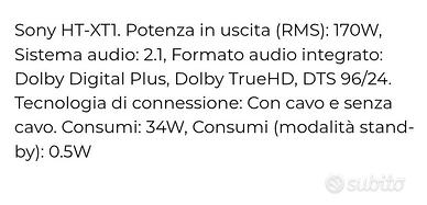 Sony XT-XT1 , Soundbar con ripiano in cristallo ( sostiene fino a 35 kg. ) , qualità sonora ottima , due sub woofer integrati , presa HDMI arc (potete usare telecomando di casa) . Manca la griglia anteriore , ma l'audio non ne risente , anzi . Prezzo trattabile , zona Spinaceto .