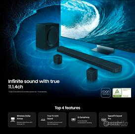 Completa l'esperienza cinematografica a casa con la soundbar Samsung HW-Q990D, è composta da una soundbar, un subwoofer e due altoparlanti posteriori (possono essere usati anche come frontale) Con il telecomando del tuo TV, puoi controllare non solo il televisore, ma anche le funzioni principali della soundbar, come il pulsante di accensione, il volume e vari effetti sonori. (Dispongo anche del telecomando separato e dedicato solo alla soundbar)