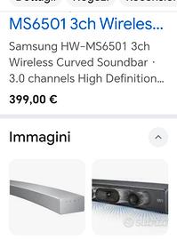 Vendo Soundbar Samsung 6501,canali 3, Barra curva per un suono avvolgente per tutte le TV ,colr silver ,9 Altoparlanti di cui 6 Woofer per bassi potenti e profondi,450 Watt in uscita, Dolby Digitale 5.1,Cristall Amplfier, bluetooth HI-FI Codec,3D Video Pass,4K Video Pass,HDR, connessione Bluetooth Power on, HDMI ARC, HDMI cec, completa di cavo e telecomando