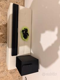 La soundbar è completa di subwoofer wireless e cavi per il collegamento elettrico e alla Tv tramite HDMI, bluetooth o cavo ottico.