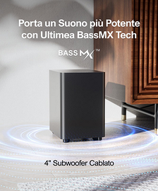• Subwoofer cablato da 4 pollici con tecnologia BassMX: La soundbar per tv Aura A30 è dotata di un subwoofer con tecnologia Ultimea BassMX per migliorare il suono a bassa frequenza.