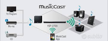 SOUNDBAR YAMAHA MUSIC CAST YSP 2700 VENDESI YAMAHA MUSIC CAST YSP 2700 SOUND BAR 7.1CH COMPLETA E PARI AL NUOVO TUTTI GLI ACCESSORI PRESENTI - PROVA E RITIRO A DOMICILIO. * Tecnologia Digital Sound Projector con 16 altoparlanti in grado di riprodurre un suono a 7.1 canali; Subwoofer wireless per bassi ricchi e profondi; *INTELLIBEAM ™ attiva automaticamente il campo sonoro ottimale per ogni stanza; *10 programmi CINEMA DSP; *Decodifica dei formati Audio HD (Dolby TrueHD®, DTS-HD®); *Supporta la musica in alta risoluzione fino a 192 kHz / 24-bit (Flac / WAV / AIFF) HDMI (3 in /1 out) con pass through 4K60p e HDCP2.2; *Bluetooth® per lo streaming wireless della musica Supporto uscita Bluetooth per sincronizzare YSP-2700 con altri prodotti Bluetooth.
