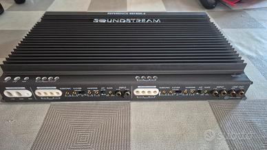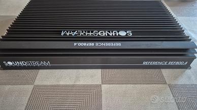 Soundstream Reference REF800.4 1 × 128 watts, channel 1 at 4 Ohm 2 × 123 watts, channel 1 + 2 at 4 Ohm 4 × 113 watts, channel 1 up to 4 at 4 Ohm Current consumption 50A efficiency 67,2% 1 × 420 watts, channel 1 + 2 bridged at 4 Ohm 2 × 361 watts, channel 1 + 2 and 3 + 4 bridged at 4 Ohm with 13,4V supply voltage Current consumption 89,9A efficiency 59,9% 722 watts total power Amplificatore come nuovo usato pochissimo prezzo trattabile