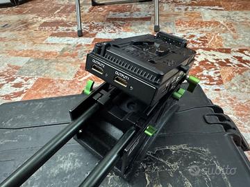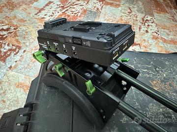 Piastra di alimentazione con porta batteria V-lock, Accessori vari, cavi di collegamento, prolunghe filettate di varie lunghezze, valigia di trasporto.